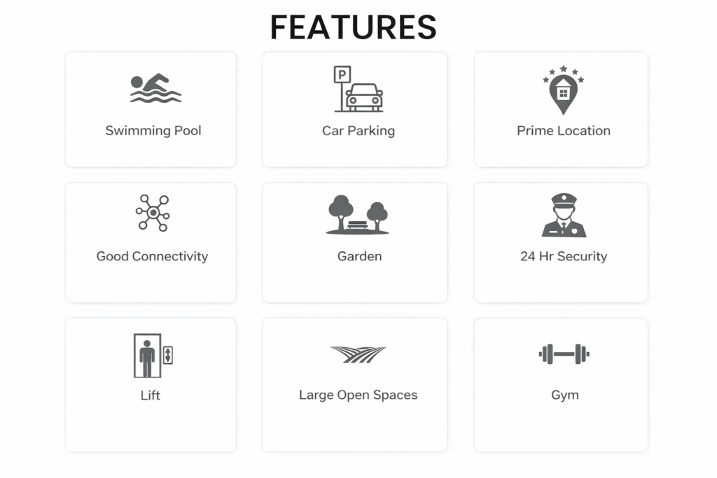 - Extensive Amenities — Large swimming pool with Jacuzzis, gymnasium, clubhouse (restaurant, cafeteria, conference room), kids’ play areas, senior citizen zones, jogging/cycling tracks, meditation/yoga spaces, indoor/outdoor sports (badminton, basketball, tennis), theme parks, landscaping, 24×7 security/CCTV, power backup, fire fighting, lifts, sewage treatment, and more.
